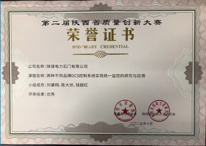 陜煤石電:《兩種不同品牌DCS控制系統實現統一監(jiān)控的研究與應用》獲陜西省質量創(chuàng)新大賽優(yōu)秀獎